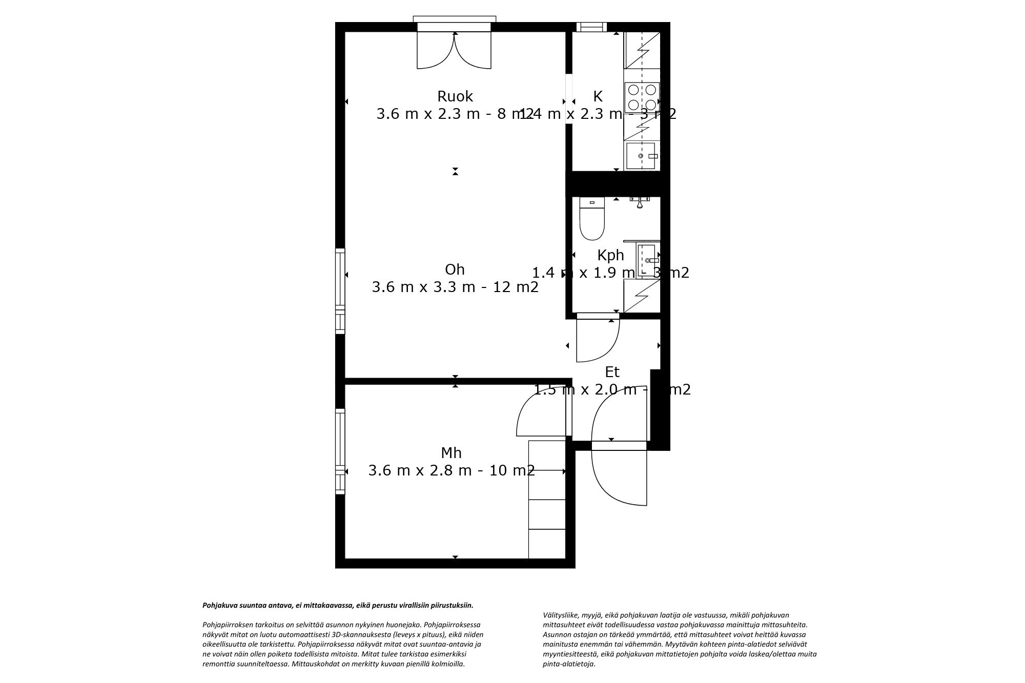 - Pinta-alaa ei ole tarkistusmitattu. Edellä mainittu pinta-ala saattaa tämän ikäisessä kohteessa poiketa olennaisestikin huoneiston nykyisen ja rakentamisaikaisen mittaustapojen ja standardien mukaan laskettavasta pinta-alasta. Huoneiston todellinen pinta-ala voi siis olla yhtiöjärjestyksessä, isännöitsijäntodistuksessa ja esitteessä mainittua pienempi tai suurempi.