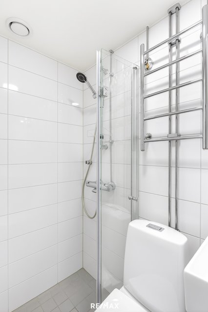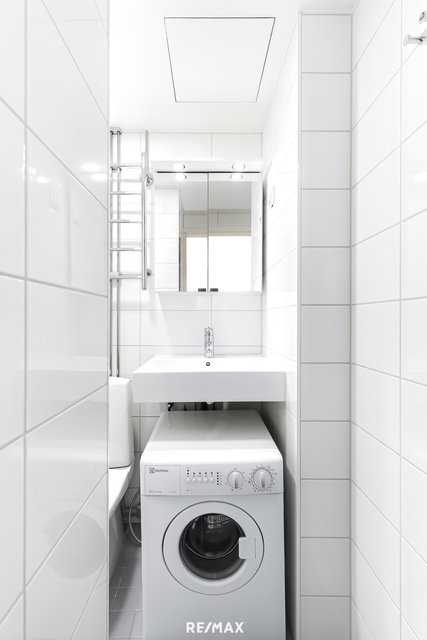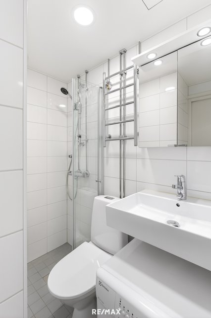 - WC-istuin, suihku, suihkuseinä, pesukoneliitäntä, lattialämmitys, peilikaappi, peili, pesuallas, bidee-suihku, ja pesukone