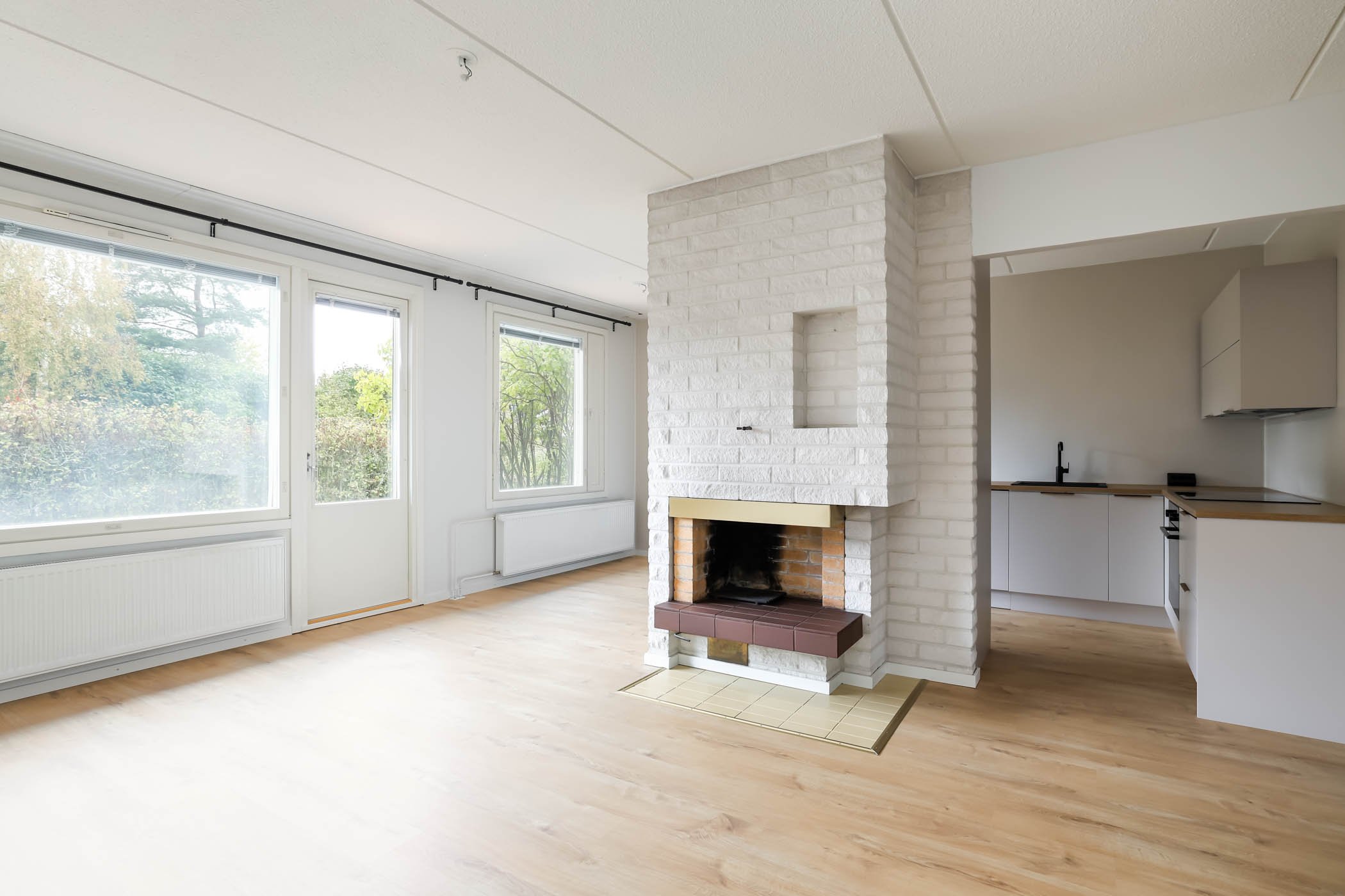Avoin yhteys keittiön ja ruokailutilan välillä tekee tilasta ilmavan ja viihtyisän, ja sähkövedot on päivitetty vastaamaan nykypäivän tarpeita. Olohuoneessa tunnelmaa luo kaunis takka, joka tuo rytmiä ja lämpöä arkeen.