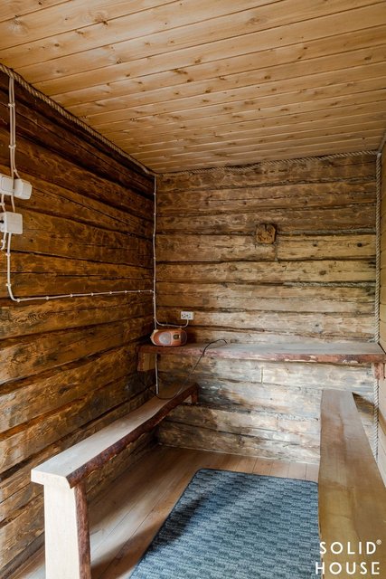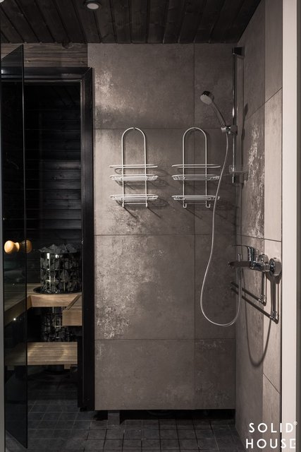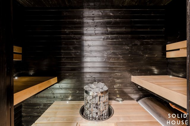 - Saunassa sähkökiuas. Lattia laattaa, seinät puuta. Ikkunoissa sälekaihtimet.