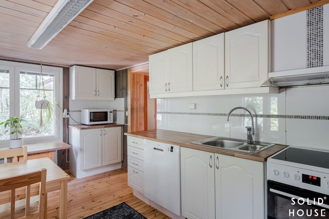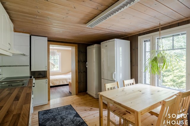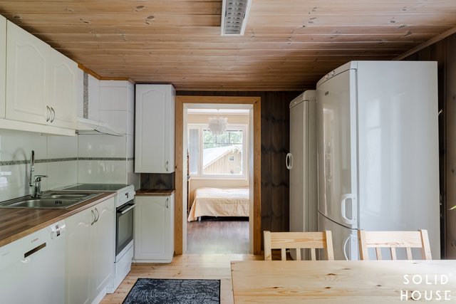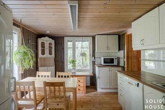 - Jääkappi, pakastekaappi, pakastin, keittiön irrallinen kulmakaappi, keraaminen liesi, liesituuletin (suodatin), mikroaaltouuni, astianpesukone, laminaattitasot. Lattia ja seinät puuta.