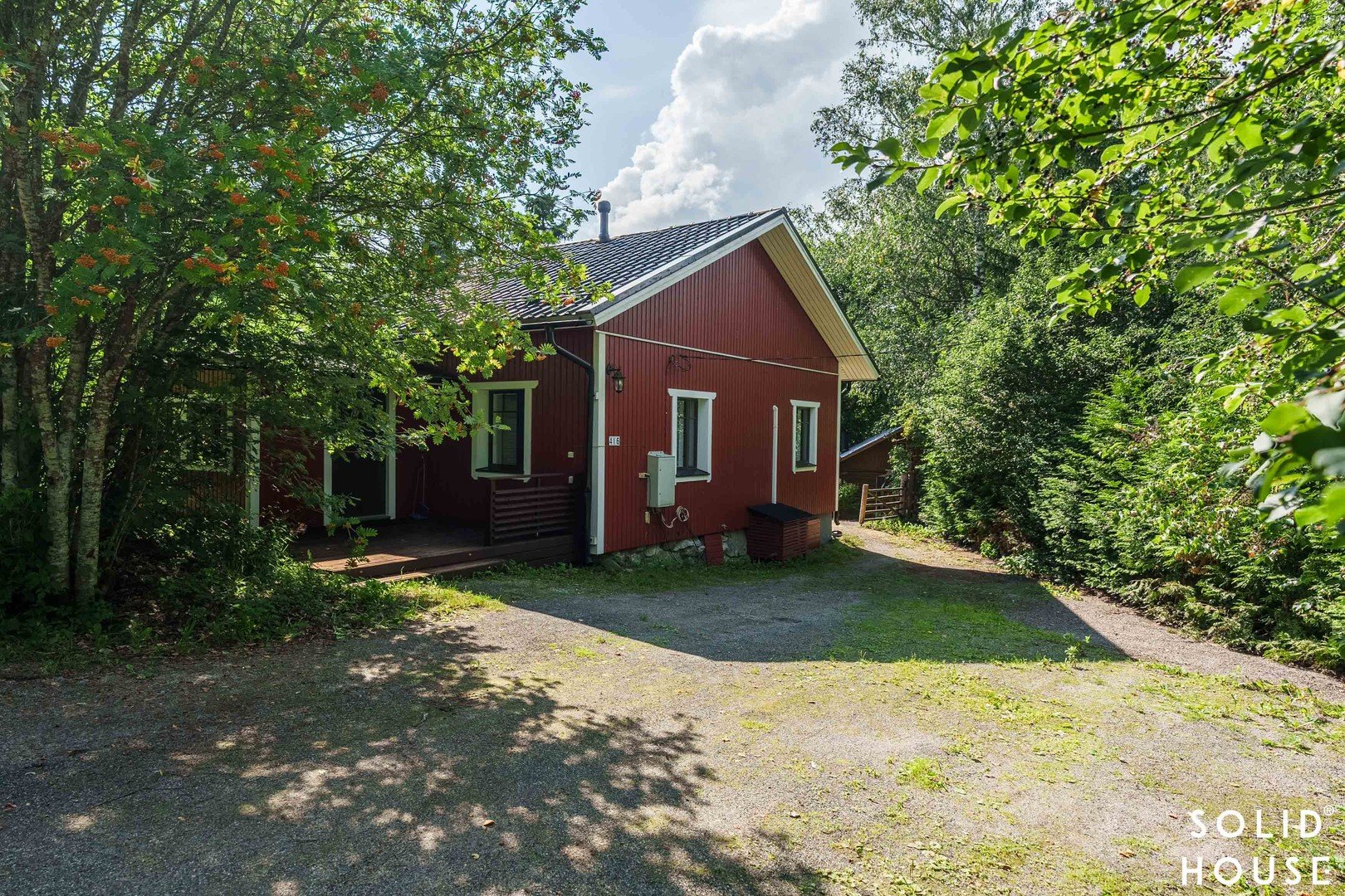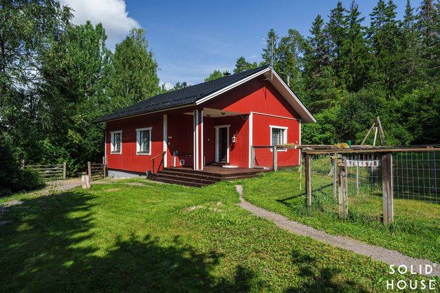 - Omakotitalo, varastorakennus, hirsisauna ja pieni kanalarakennus.