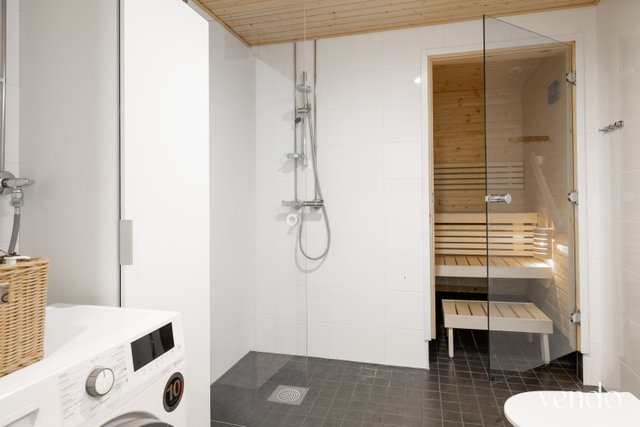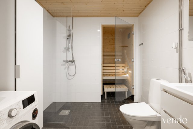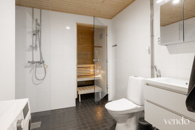 - WC-istuin, suihku, suihkuseinä, pesukoneliitäntä, lattialämmitys, peilikaappi, pesuallas, allaskaappi, ja bidee-suihku