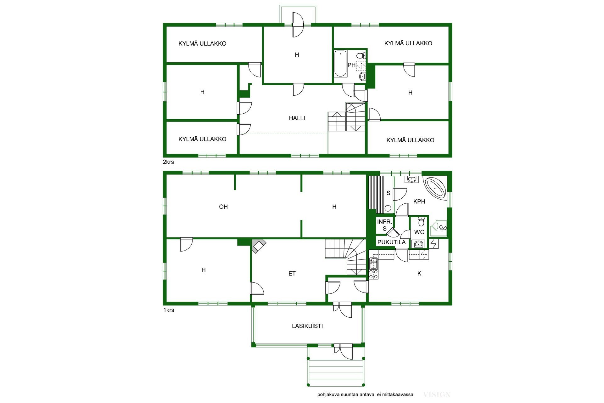 - 1. kerroksessa on työhuone. Hallitilasta on kulku yläkertaan. Pääsisäänkäynnin yhteydessä on n. 14,5 m2 lasikuisti. 2. kerroksessa on avara halli ja huoneiden sivuilla on tilavat ullakot.