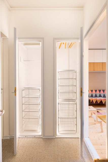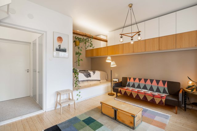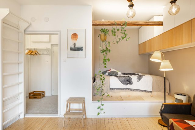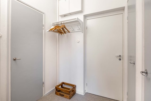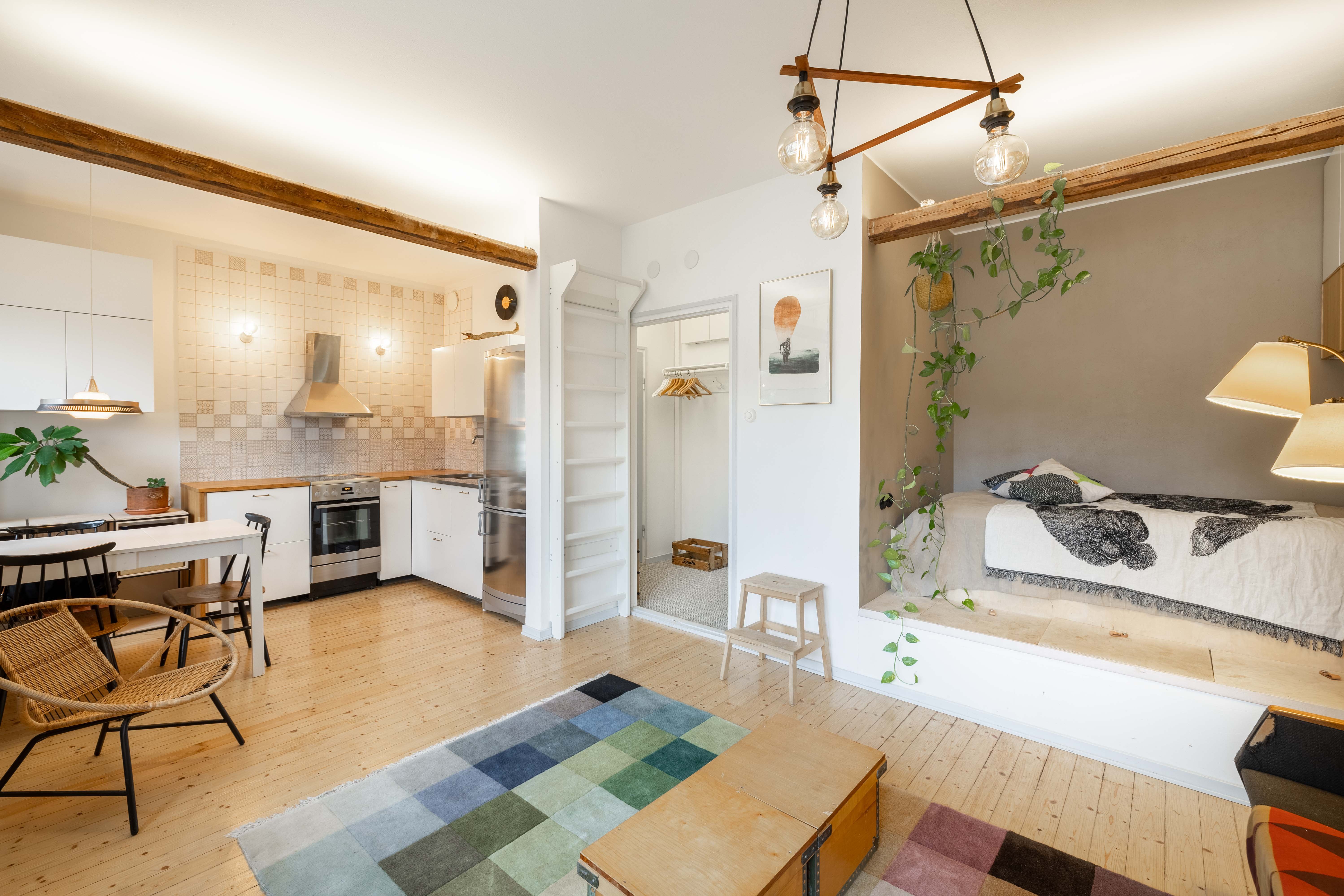- Kattoon asennettu iäkkäät puupalkit 1800-luvulta ja säädettävät valot, sälekaihtimet on kahdessa ikkunassa ja parvekkeen ovessa, seinällä runsaasti kaappitilaa ja alkoviin rakennetun laverin alla iso säilytystila.