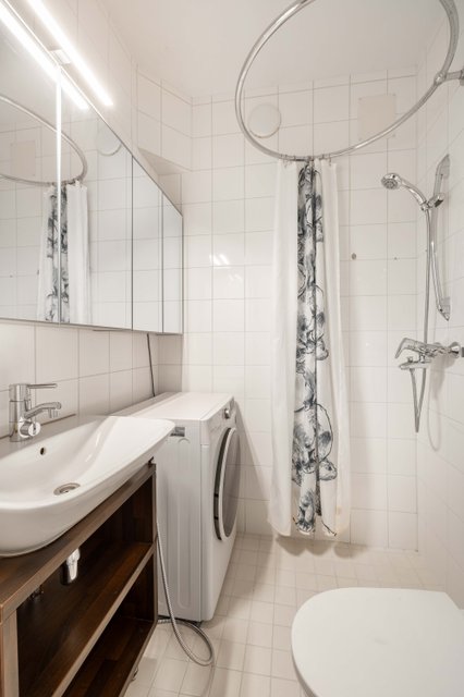 - WC-istuin, suihku (pyöreä suihkuverhoteline), pesukoneliitäntä, bidee-suihku, peilikaappi (koko seinänlevyinen, valolla), pesuallas (alla hyllystö), pyyhekuivain, ja pyyhekuivain