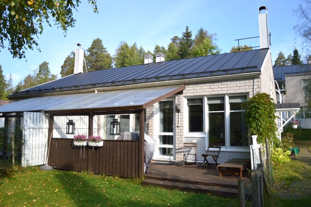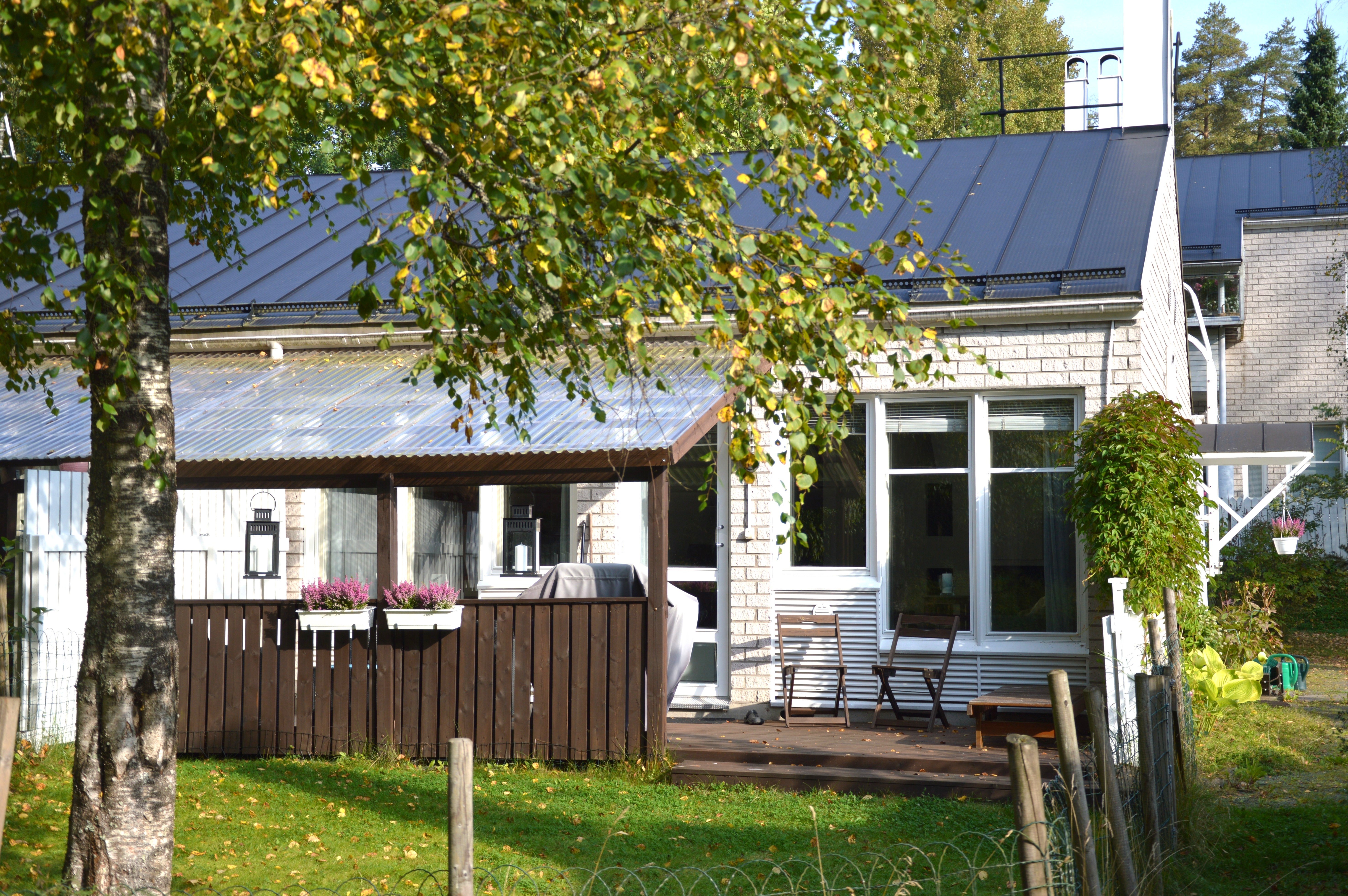 - Päätyhuoneisto/paritalo. Suojaisa takapiha. Katettu terassi ja isohko aidattu nurmialue.