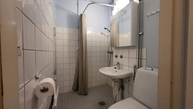 - WC-istuin, suihku, pesuallas, peilikaappi, ja pesukoneliitäntä
