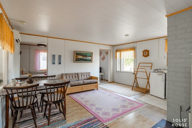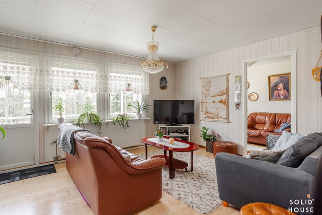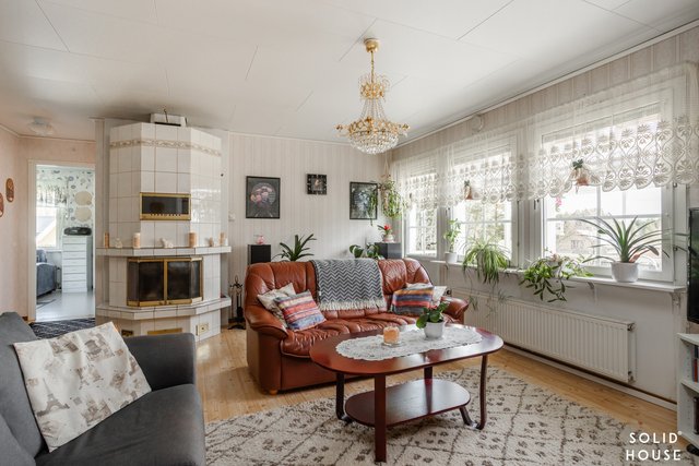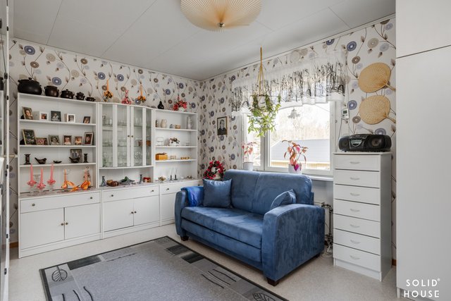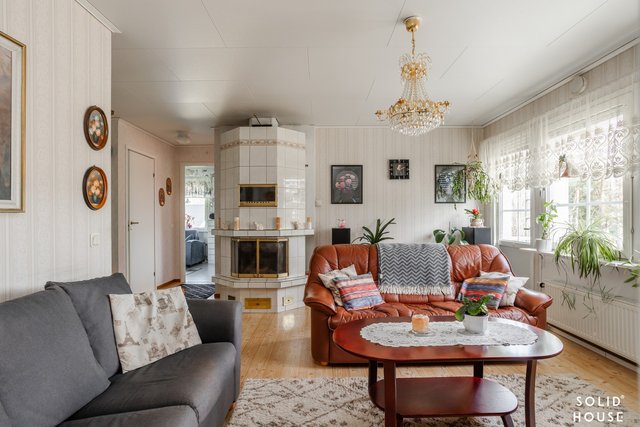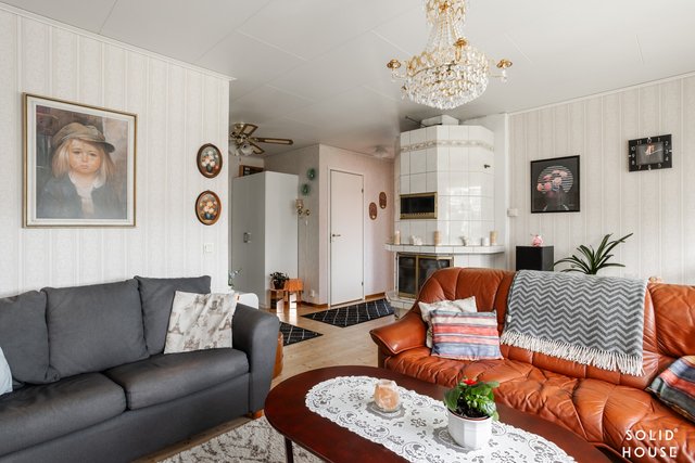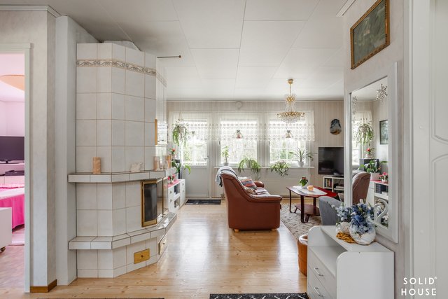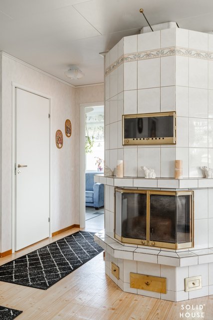 - Valoisa olohuone, jossa varaava takka. Kulku terassille. Seinä: tapetti. Lattia: muovimatto.