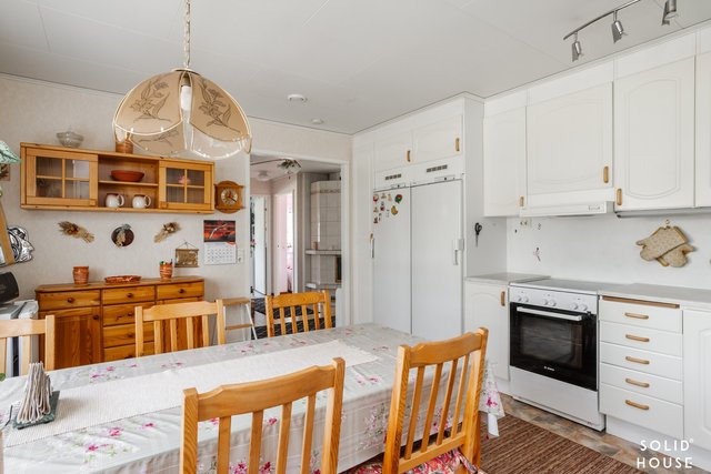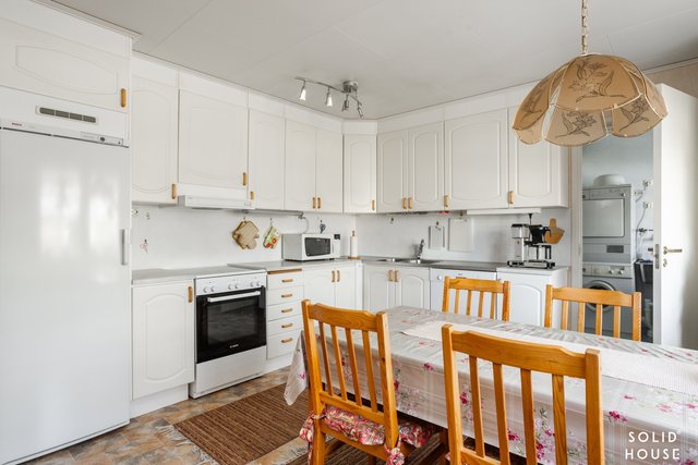 - Tilava keittiö, johon mahtuu isompikin ruokailuryhmä. Jääkaappi, pakastin, keraaminen liesi, astianpesukone, liesituuletin ja mikro. Runsaasti kaappitilaa ja työtasoa Seinät: tapettia. Lattia: muovimatto. Työtasot: laminaattia.