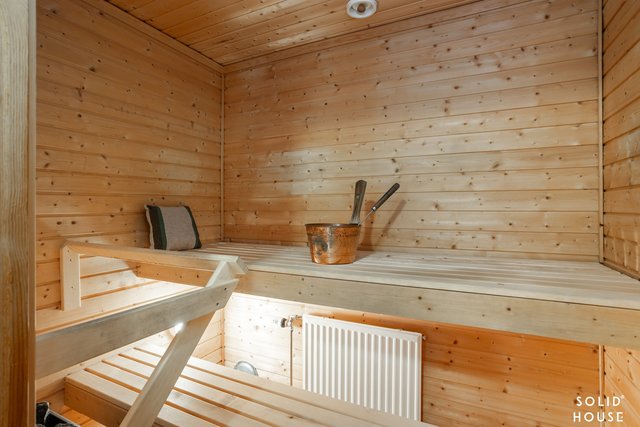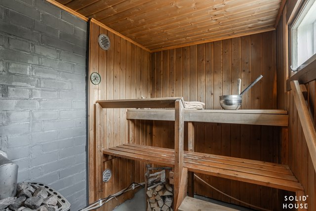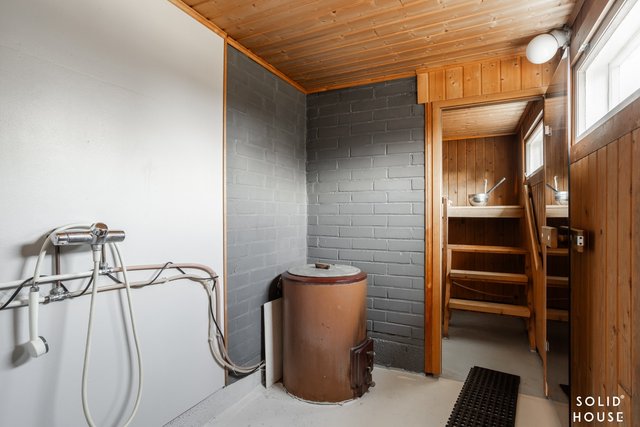 - Sähkökiuas, lauteet puuta. Seinät: puuta. Lattia: muovimatto.