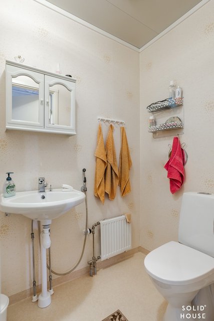 - Wc-istuin, pesuallas. Seinät: tapettia. Lattia: muovimatto.