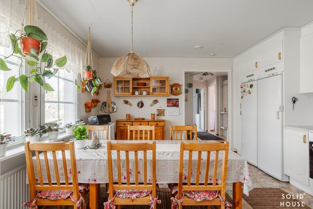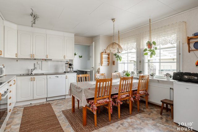 Keittiö on hyvin varusteltu ja sinne mahtuu useampikin ruokailemaan saman pöydän ääreen.