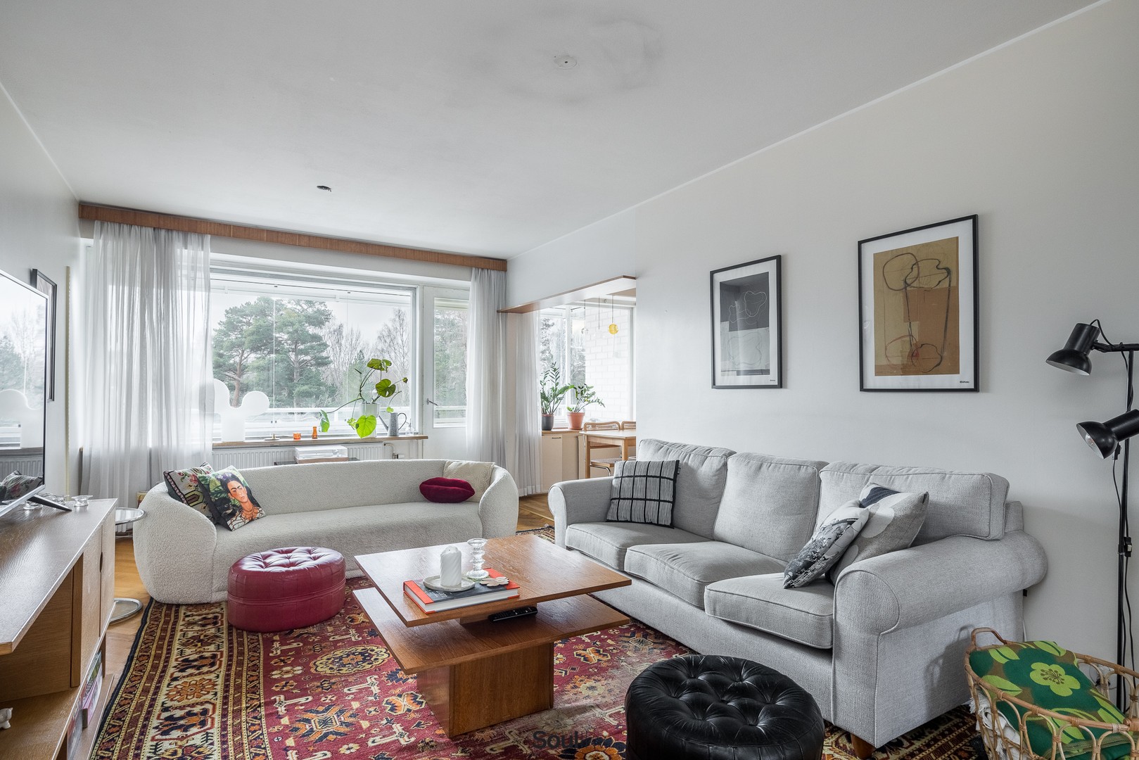 Valoisasta olohuoneesta on käynti lounaaseen suuntautuvalle lasitetulle parvekkeelle. Olohuoneen ja keittiön välistä seinää on avattu, mutta tilat ovat edelleen erilliset. Tilaan mahtuu hyvin ruokailuryhmä. Olohuoneessa on kaunis kalanruotoparketti, joka on osittain kulunut, mutta huoltamalla sen saa uuteen loistoon.