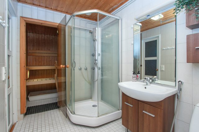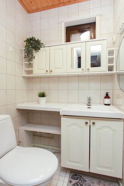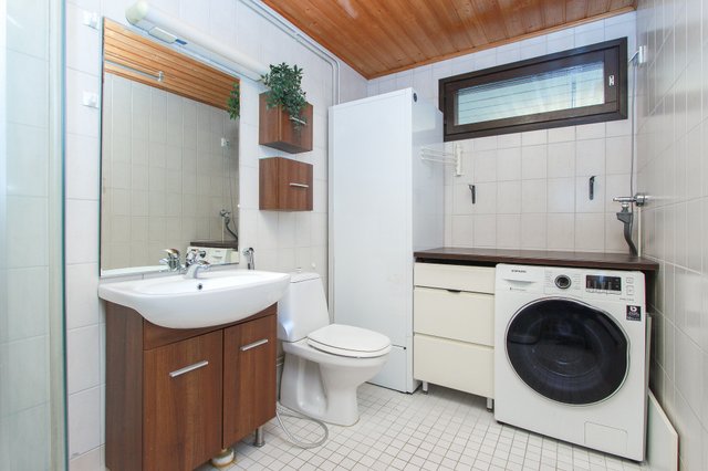 - Suihku, suihkukaappi, pesuallas, wc-istuin, kaapistot, pesukoneliitäntä, ikkuna. Seinät ja lattia laattaa, lattialämmitys.