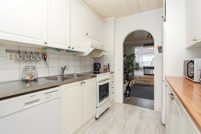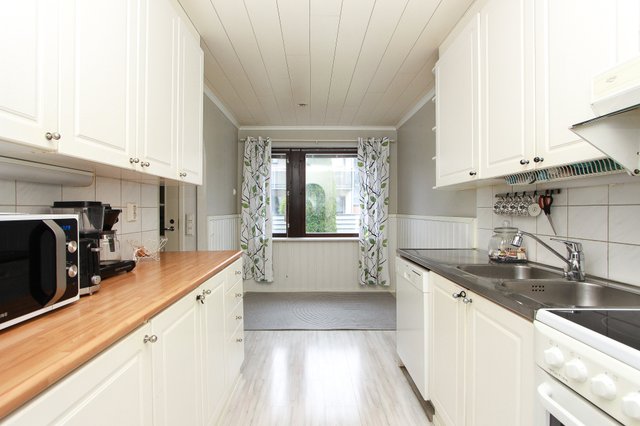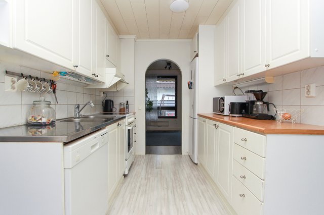 - Kaapistot, sähköliesi, liesituuletin, jääkaappipakastin, astianpesukone. Seinät maalattu, välitilassa laatta, lattia laminaattia.