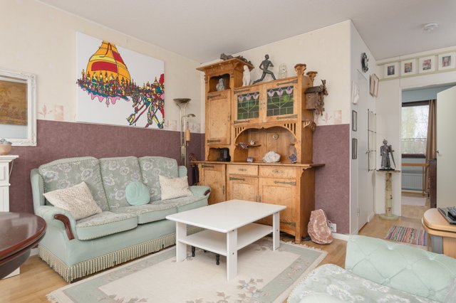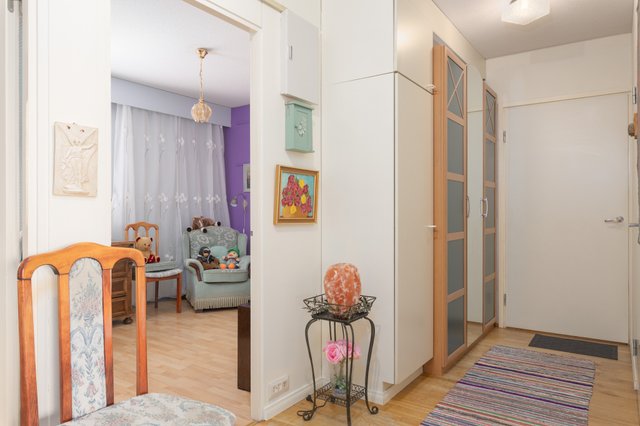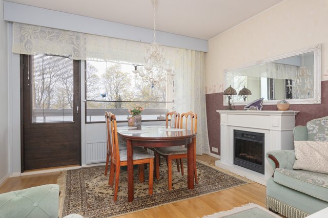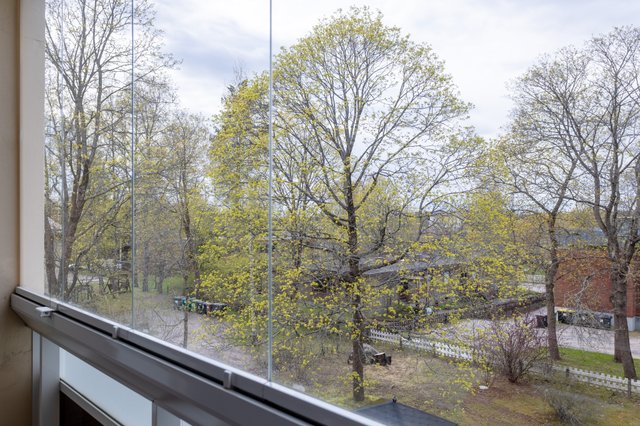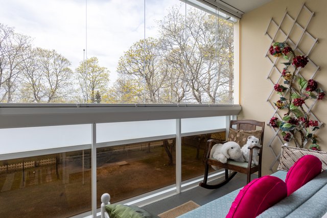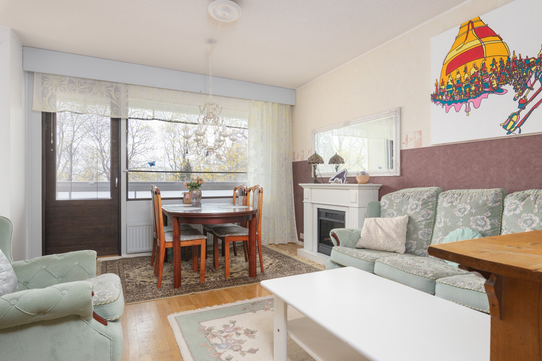 Asunnon sydän on valoisa olohuone, josta on käynti lasitetulle parvekkeelle. Parveke tarjoaa viihtyisän lisätilan aikaisesta keväästä pitkälle syksyyn ja avautuu rauhalliselle näkymälle puiden katveeseen.