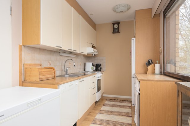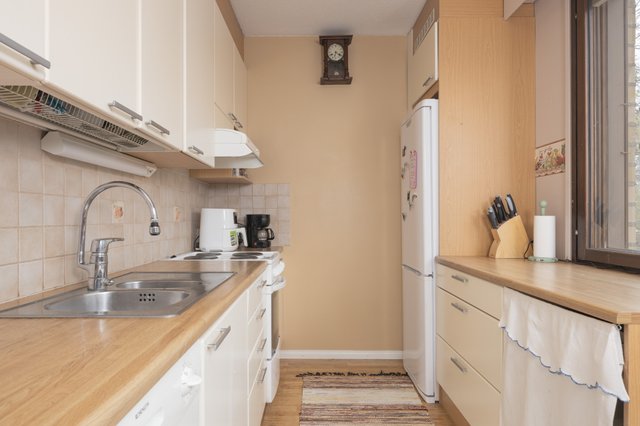 Erillinen keittiö tarjoaa hyvin säilytys- ja työskentelytilaa, ja sen yhteydessä on ruokailutila, johon mahtuu suurempikin ruokapöytä. Ikkunat tuovat keittiöön runsaasti luonnonvaloa.