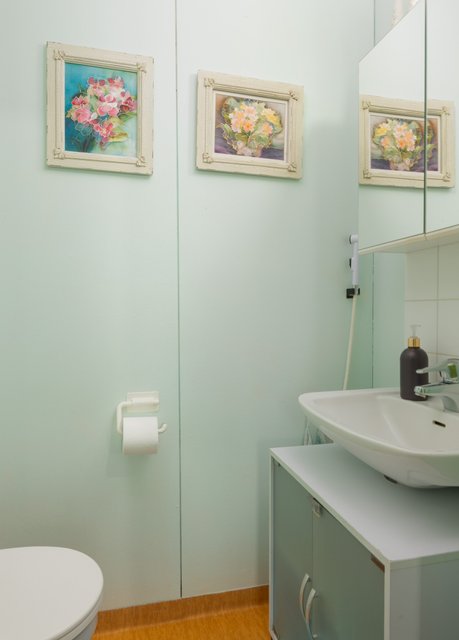 - Suihku, pesuallas, peilikaappi, pesukoneliitäntä, kaapisto.