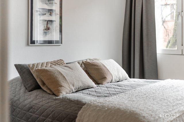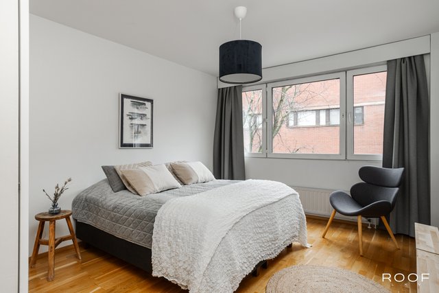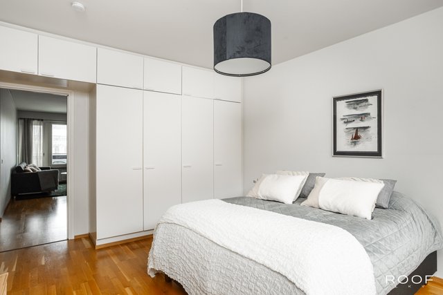 - Viihtyisän makuuhuoneen ikkuna avaa näkymän sisäpihan puolelle, tuoden huoneeseen pehmeää luonnonvaloa. Tila on helppo sisustaa omien tarpeiden mukaan, ja säilytysratkaisut on toteutettu käytännöllisesti.
