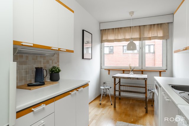 Keittiössä on runsaasti työskentely- ja kaappitilaa, ja ikkunoiden edessä oleva ruokailutila avautuu rauhalliseen sisäpihaan. Myös makuuhuone sijoittuu pihan puolelle, tarjoten levollisen ympäristön niin lepoon kuin työskentelyyn.