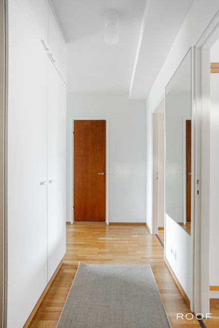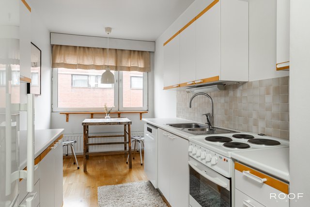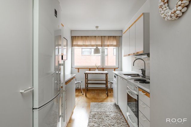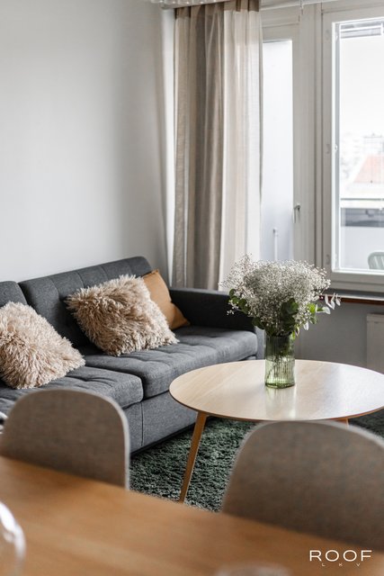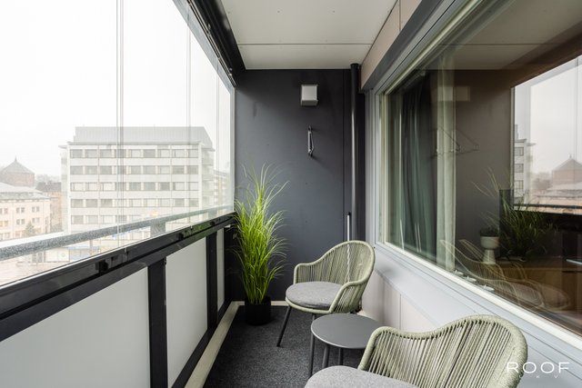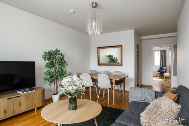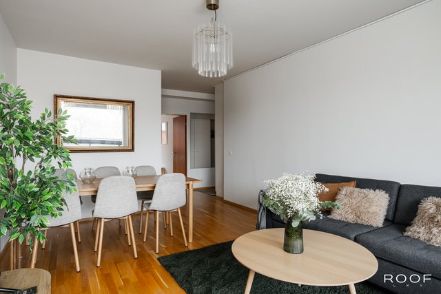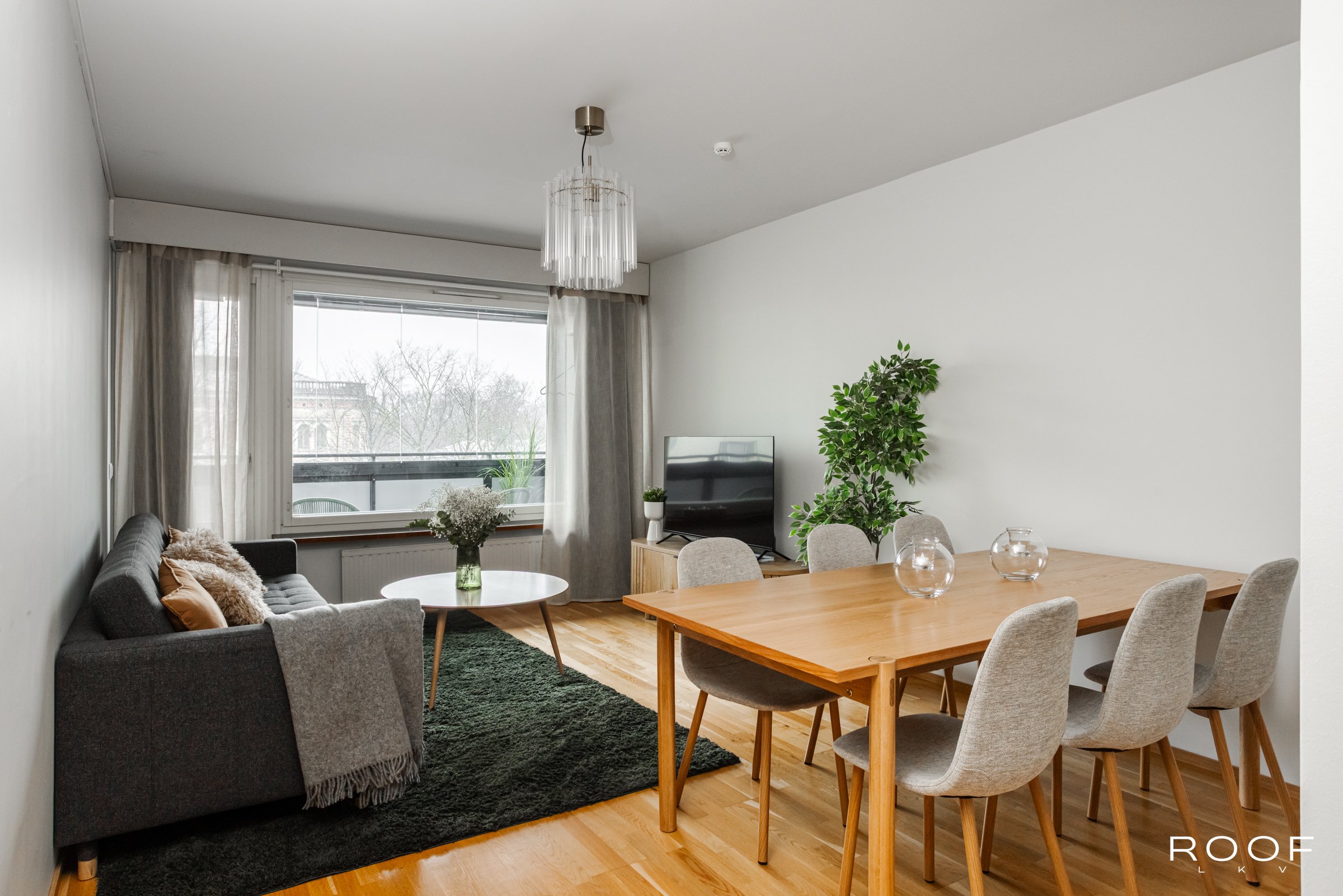 Avara olohuone tarjoaa tilan sekä oleskelulle että ruokailuryhmälle, ja suuret ikkunat tuovat sisään runsaasti luonnonvaloa. Lasitettu parveke toimii suojaisana lisähuoneena, jossa voi nauttia kaupunkinäkymistä säällä kuin säällä.