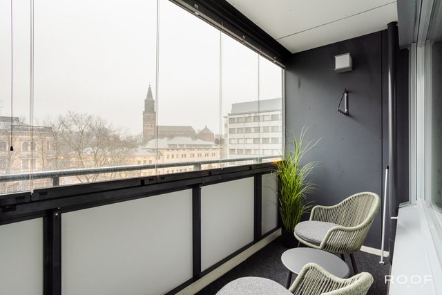 - Avarasta olohuoneesta on kulku lasitetulle parvekkeelle, josta aukeaa upeat näkymät Turun tuomiokirkolle. Olohuoneessa on hyvin tilaa myös isommalle ruokailupöydälle.