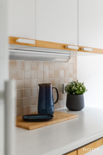- Valoisassa keittiössä on hyvin kaappi- ja työskentelytilaa. Valkoiset kaapistot yhdistettynä puunsävyisiin yksityiskohtiin tuovat tilaan sekä raikkautta että lämpöä. Ruokailutila asettuu luontevasti suuren ikkunan ääreen, ja kokonaisuus on käytännöllinen ja selkeä.