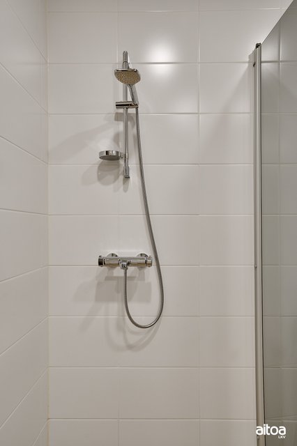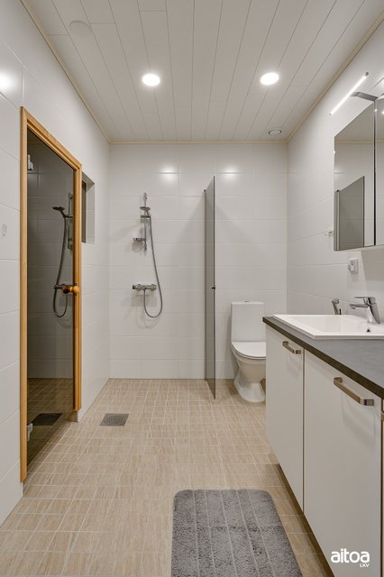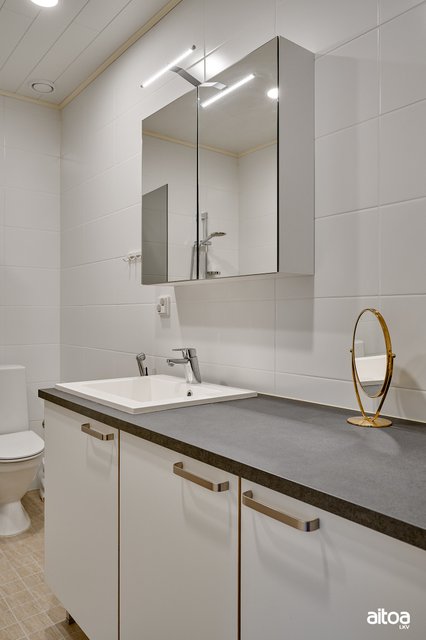 - WC-istuin, suihku, suihkuseinä, lattialämmitys, pesukoneliitäntä, peilikaappi, pesuallas, allaskaappi, ja bidee-suihku