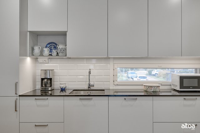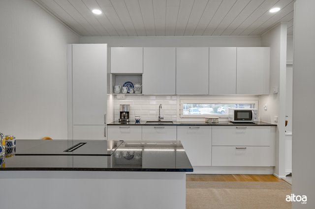 - Laadukas keittiö, kivitasoin ja integroiduin kodinkonein. Välitilassa valkoinen fasettihiottu laatta ja led valaistus.