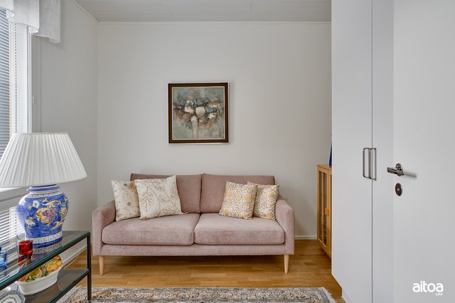 Kaksi makuuhuonetta tarjoavat rauhalliset puitteet lepoon, ja päämakuuhuoneen lasiset pariovet tuovat avaruutta tilaan. Kylpyhuoneessa on reilusti tilaa pyykkihuollolle ja oma sauna tarjoaa rentoutumishetkiä kiireisen päivän päätteeksi. Toinen, erillinen wc tuo arkeen käytännöllisyyttä.