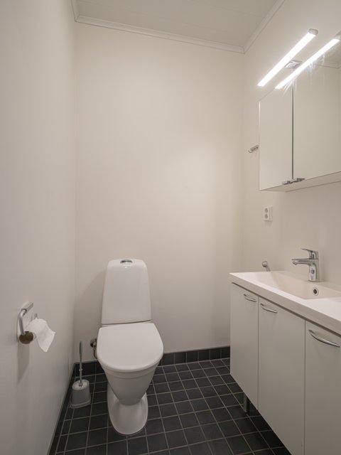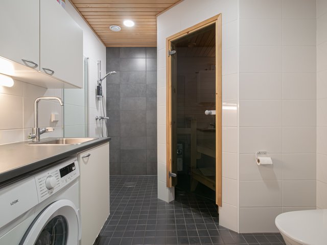 - WC-istuin, suihku, suihkuseinä, pesukoneliitäntä, ja lattialämmitys