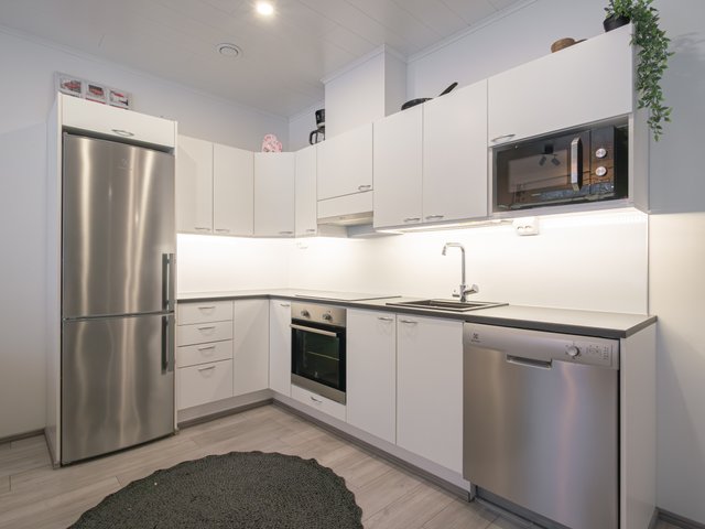 - Jääkaappipakastin (Electrolux, harmaa), uuni (Electrolux, harmaa), liesi (Electrolux, induktio), astianpesukone (Electrolux, harmaa), ja liesituuletin (Electrolux, harmaa)