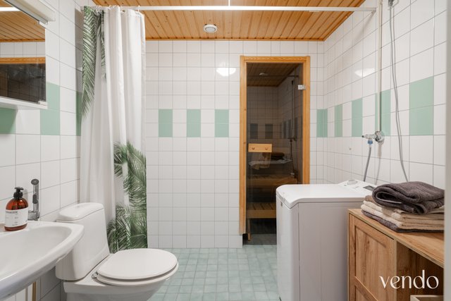 - Suihku, peilikaappi, pesukoneliitäntä, pesuallas, wc-istuin, ja bidee-suihku