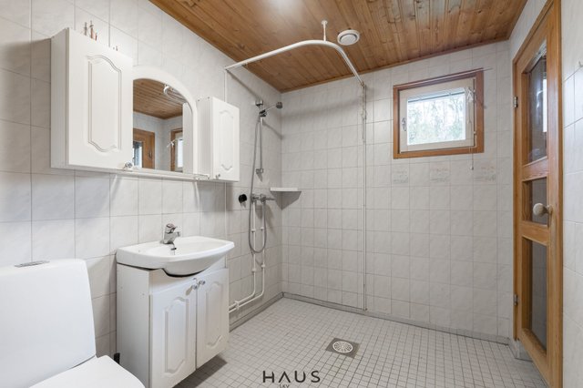 - WC-istuin, suihku, peilikaappi, peili, pesuallas, ja allaskaappi