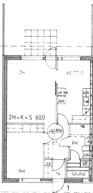 - Keittiöstä on normaali oviaukko eteiseen ja leveä aukko olohuoneeseen.