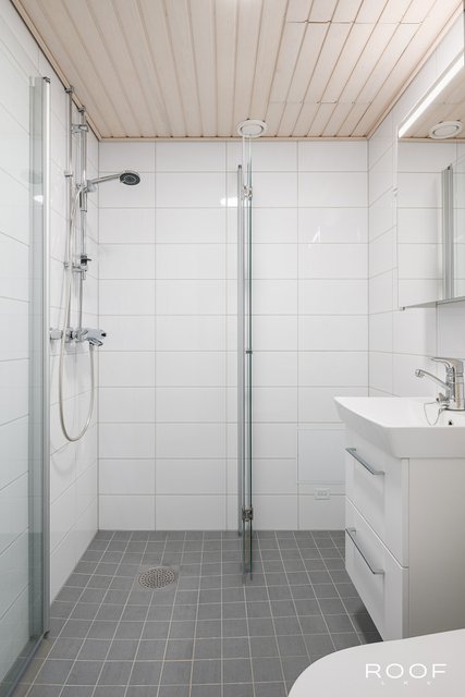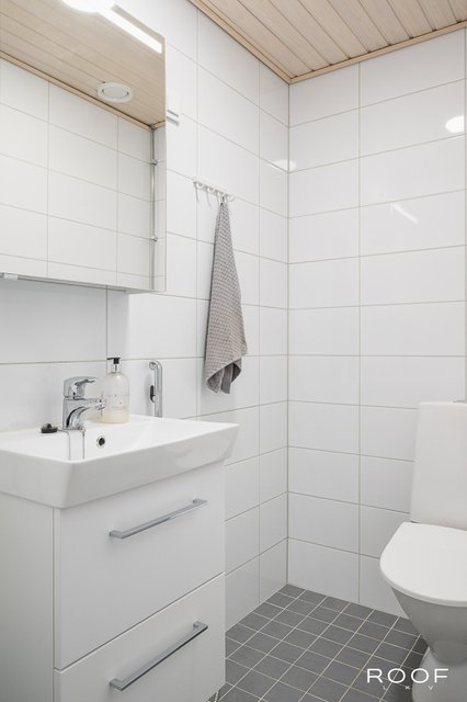 - WC-istuin, suihku, suihkuseinä, pesukoneliitäntä, allaskaappi, peilikaappi, ja bidee-suihku