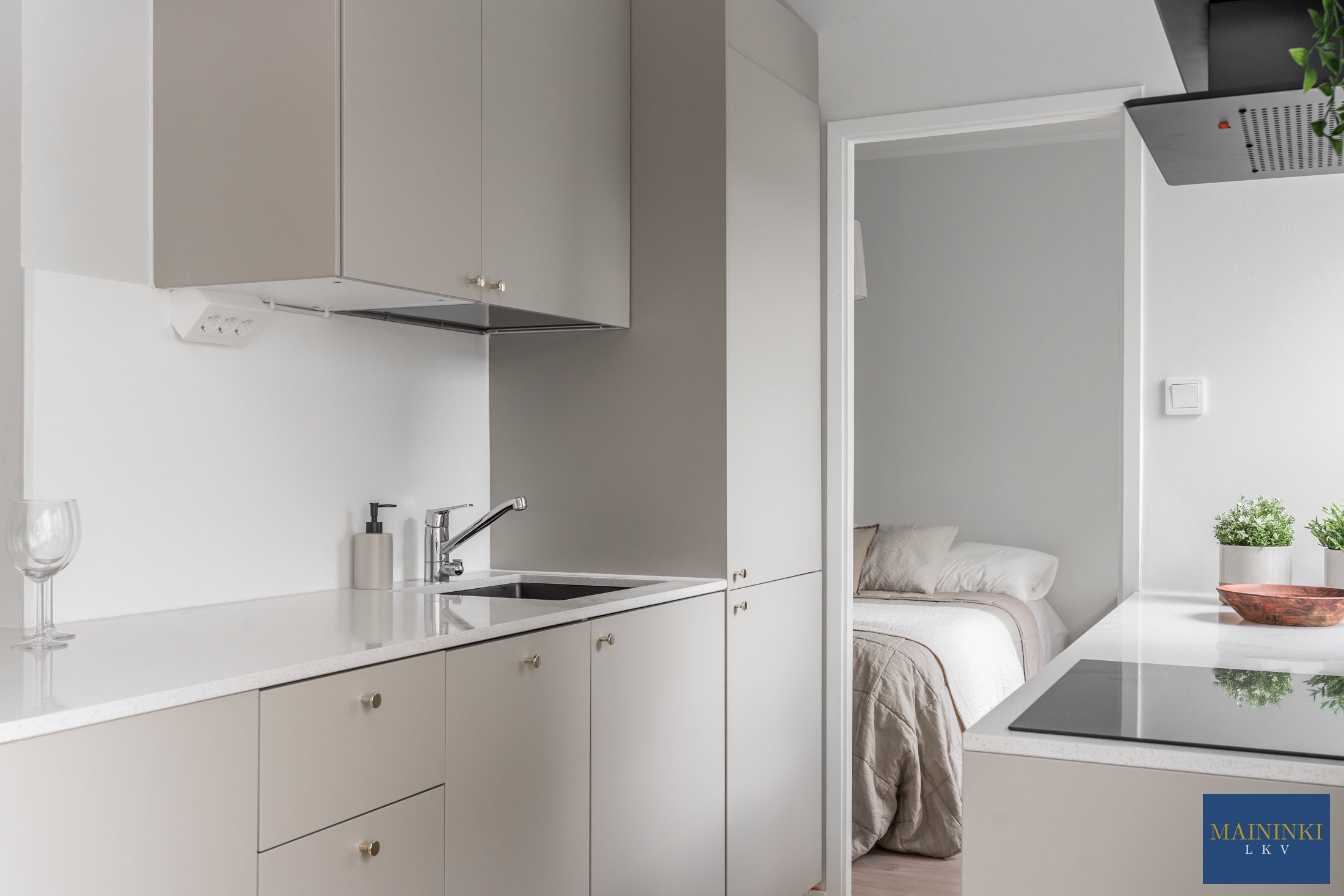 Keittiö on varusteltu modernisti - käytössäsi on mm. energiatehokas induktioliesi ja uuni sekä astianpesukone. Työtasot ovat kvartsikomposiittia, joten ne kestävät kulutusta eivätkä tahraannu. Linjasaneerauksen yhteydessä peruskorjatussa kylpyhuoneessa on tilaa pesukoneelle, mikä tekee arjesta sujuvaa. Säilytystilaa on hyvin makuuhuoneen ja eteisen kaapistoissa.
