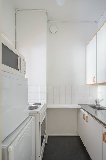 - VARUSTUS: Kaapistot, uuni, jääkaappipakastin, pesuallas, hana. SEINÄT: Maali. LATTIAT: Muovimatto.