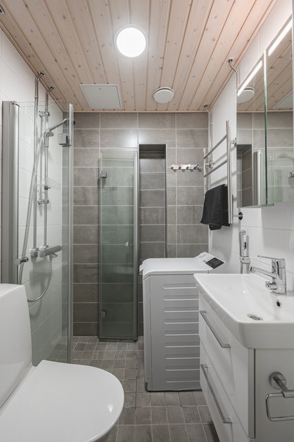 Kylpyhuone on uusittu vuonna 2020, ja se on moderni ja siisti laatoituksineen sekä valkoisine kalusteineen. Tilassa on myös paikka pyykinpesukoneelle. Keittokomero on kompakti, mutta kaikki tarpeellinen löytyy omassa rauhassaan olohuoneen vierestä.