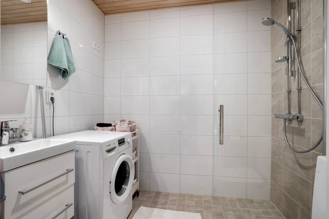 - WC-istuin, suihku, suihkuseinä, pesukoneliitäntä, lattialämmitys, peilikaappi, pesuallas, ja bidee-suihku