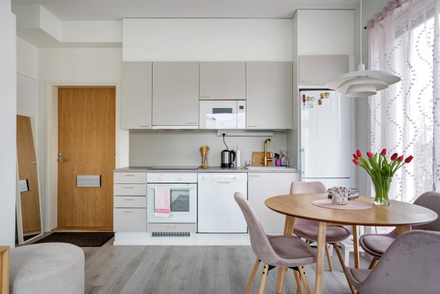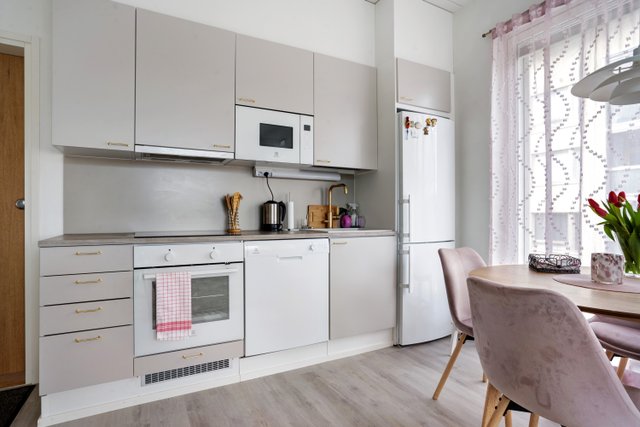 - Jääkaappipakastin, uuni, liesi, liesituuletin, ja astianpesukone
