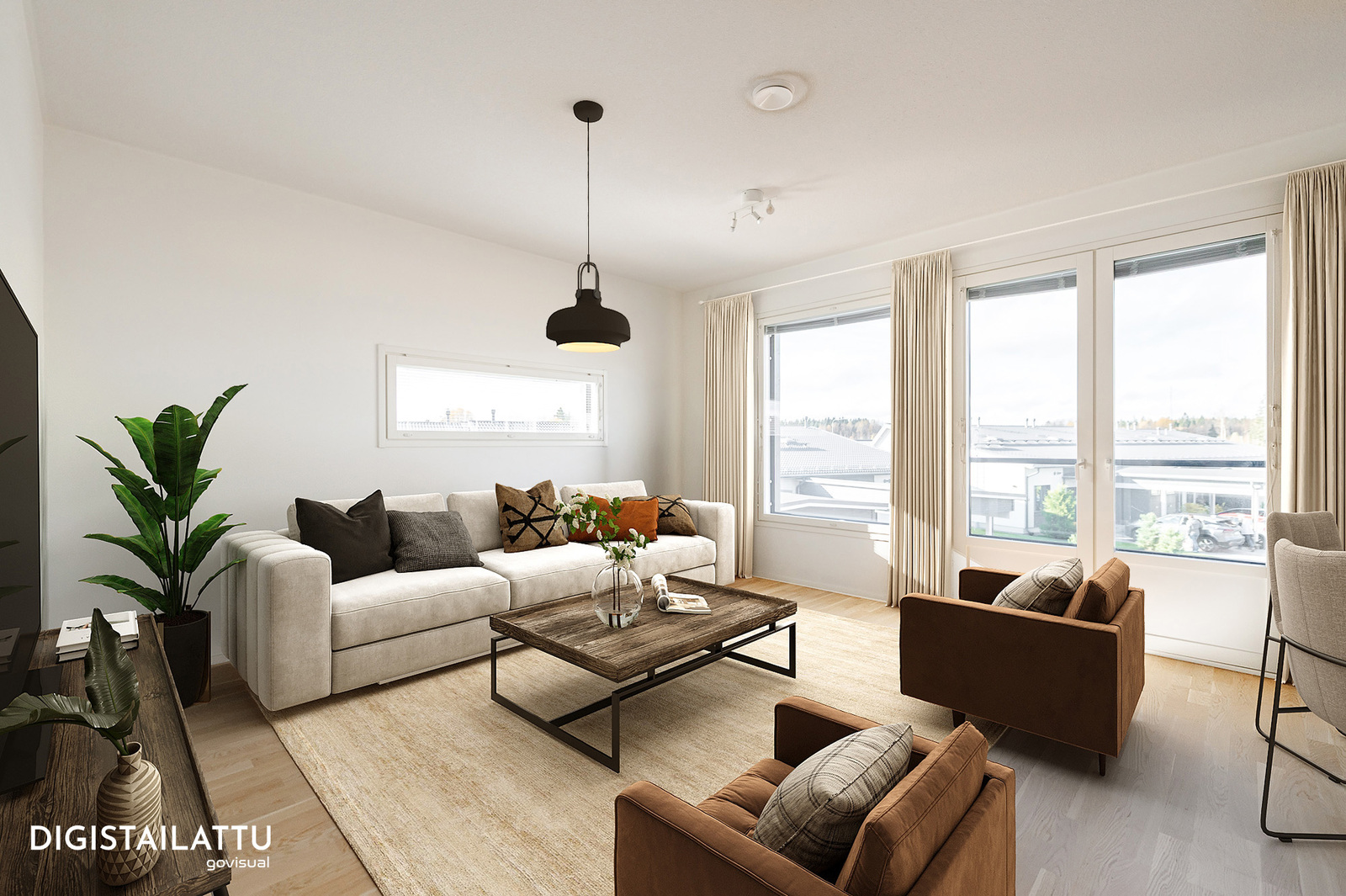 Asunto on päädyssä ja ikkoinoita kolmeen eri ilmansuuntaan.