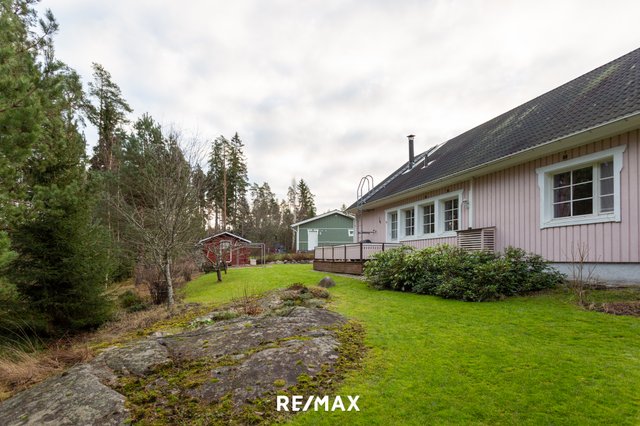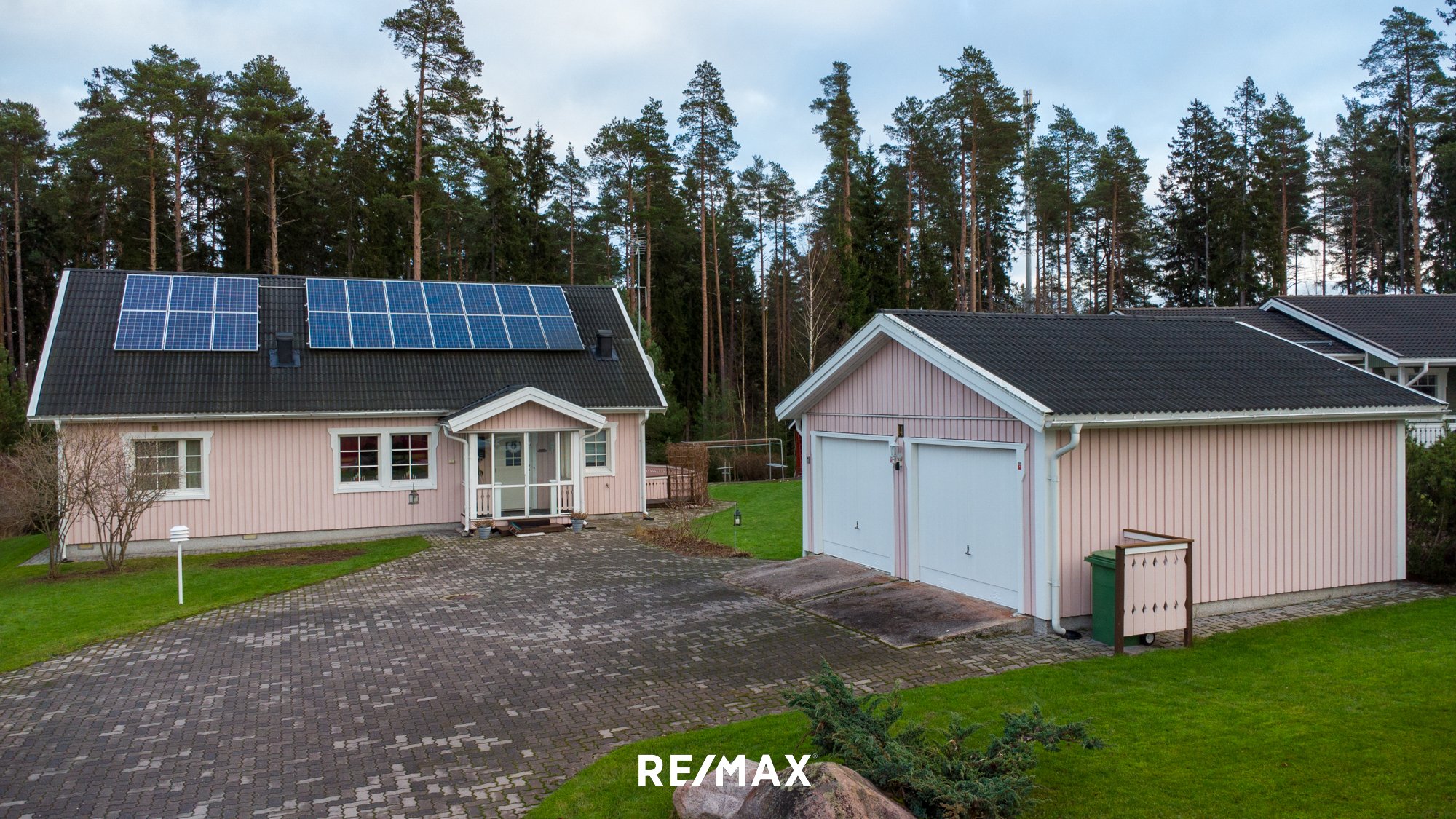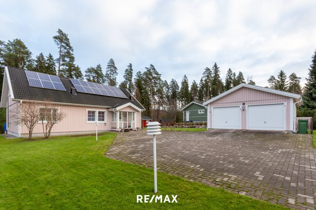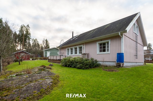 Salon kaupungin vuokratontti rajoittuu takaa metsään. Terassilla nautit kesäpäivistä ja grillailusta perheen kesken. Tontilla on myös kahden auton talli ja hirsinen puuvaja.