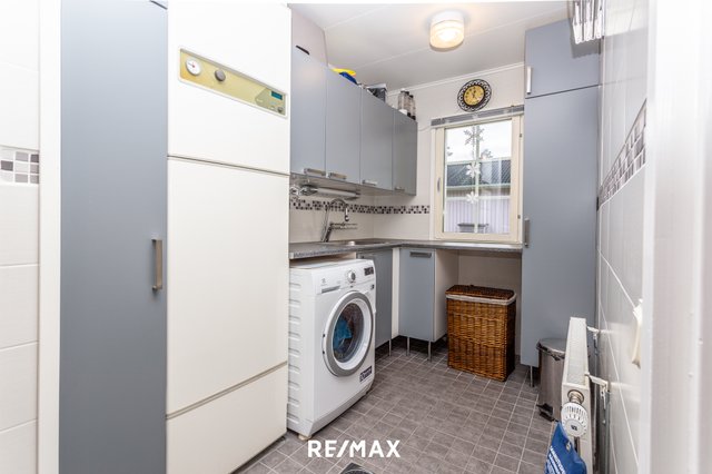 - Pesukoneliitäntä, lattialämmitys, kuivausteline, pesuallas, lattiakaivo, ja pöytätaso