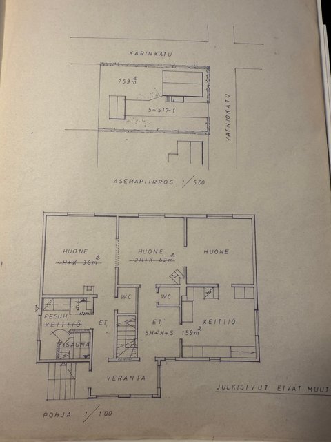 Alak: kuisti, et, 2x mh, k, oh, pesuh/s, 2x wc. Yläk: aula, 2x mh, wc.