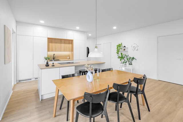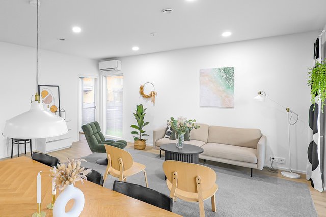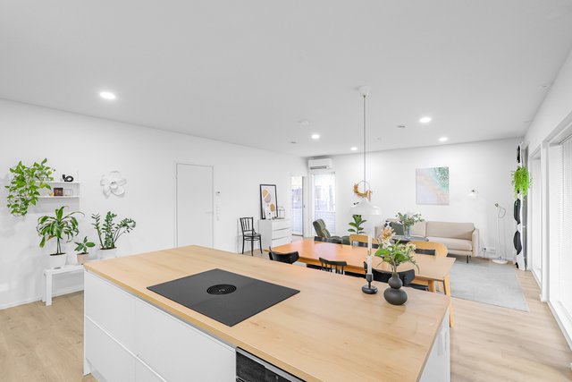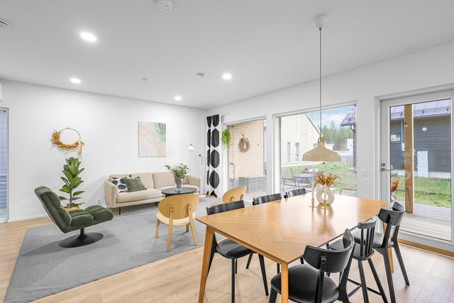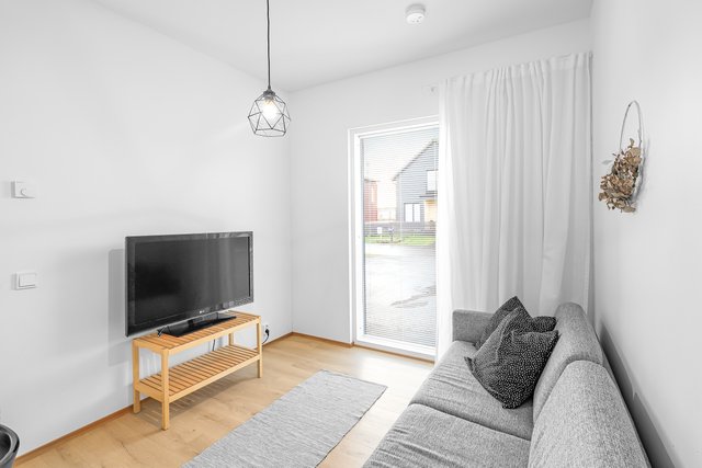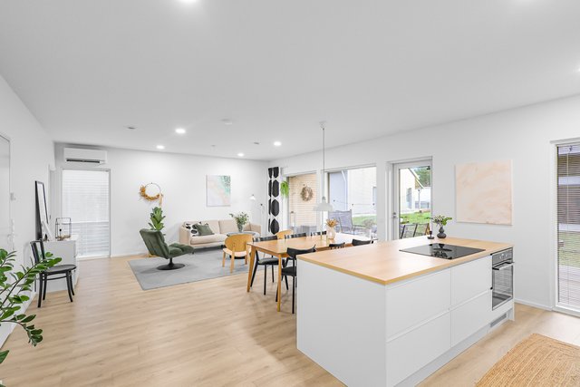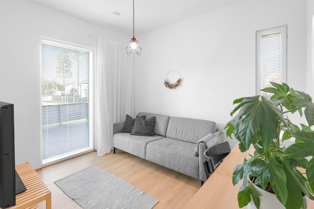 Olohuoneessa isot ikkunat tuovat valoa mukavasti asuntoon ja ilmalämpöpumppu pitää helteillä huoneilman viileänä ja auttaa lämmityskuluissa. Keittiössä on mukavasti kaappitilaa, jota löytyy myös lisäksi saarekkeesta. Laadukkaat kodinkoneet on integroituja. Olohuoneesta on käynti aurinkoiselle terasille, mikä on mahdollista myös lasittaa. Terassilta on käynti lämpimään varastoon, josta löytyy lisää säilytystilaa. Erinomaiset säilytysjärjestelmät löytyy myös sisäänkäynnin yhteydestä löytyvästä arkea helpottavasta arkieteisestä.
