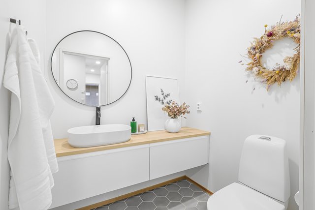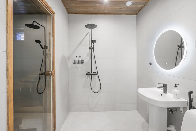 - WC-istuin, suihku, lattialämmitys, peili, pesuallas, ja bidee-suihku
