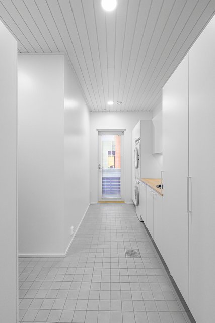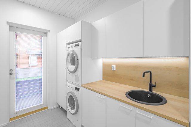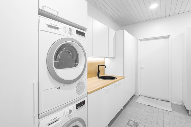 - Tila pesutornille, pesukoneliitäntä, pesuallas, lattialämmitys, pyykkikaapit, ja pöytätaso