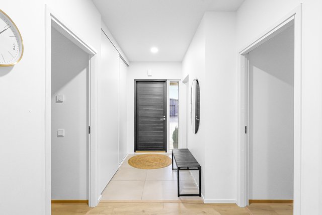 Pohjaratkaisu on tehokas ja suunniteltu todella käytännölliseksi. Yläkertavaraus mahdollistaa laajentamisen tarpeen vaatiessa. Koti pitää sisällään kolme makuuhuonetta, keittiön, olohuoneen sekä viihtyisät pesutilat ja kodinhoitohuoneen.